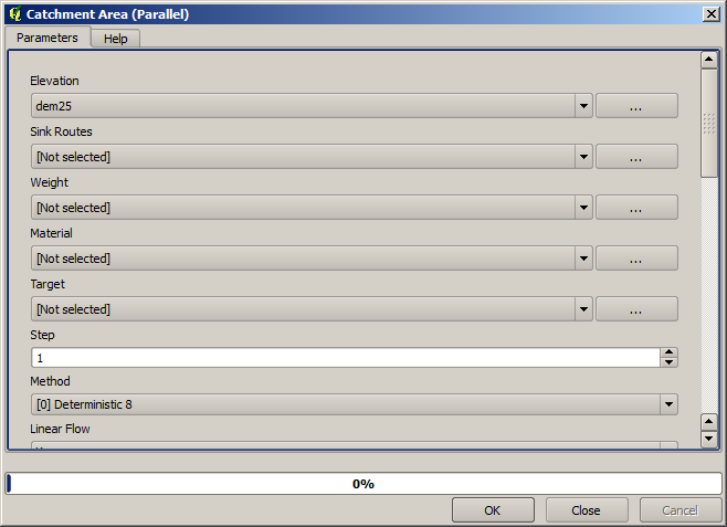 ပထမဆုံးလုပ်ဆောင်ရမည့် မော်ဂျူးသည် Catchment area (အချို့သော SAGA ဗားရှင်းများတွင် ၎င်းကို Flow accumulation (Top Down) ဟုခေါ်ဆိုပါသည်) ဖြစ်ပါသည်။ Catchment area အမည်ပါသော အခြားတစ်ခုခုကိုလည်း အသုံးပြုနိုင်ပါသည်။ ၎င်းတို့တွင် အတွင်းပိုင်း၌ မတူညီသော algorithm များပါရှိသော်လည်း အခြေခံအားဖြင့် ရလာဒ်များသည် အတူတူပင်ဖြစ်ပါသည်။
