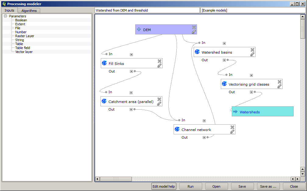 ပြီးခဲ့သည့်သင်ခန်းစာတွင် ဖန်တီးသော ပထမ model သည် အလွန်ရိုးရှင်းပြီး input တစ်ခုနှင့် algorithm ၃ ခုသာပါဝင်ပါသည်။ အမျိုးအစားကွဲပြားသော input များနှင့် အဆင့်များစွာ ပါဝင်သော ပိုမိုရှုပ်ထွေးသည့် model များကို ဖန်တီးနိုင်ပါသည်။ ဤသင်ခန်းစာအတွက် DEM တစ်ခုနှင့် threshold တန်ဖိုးတစ်ခုကို အခြေခံပြီး watershed (ရေဝေရေလဲ) ဧရိယာ vector layer တစ်ခုကိုဖန်တီးမည့် model တစ်ခုကို လုပ်ဆောင်ပါမည်။ ဤ model သည် အမျိုးမျိုးသော threshold တန်ဖိုးများဖြင့် vector layer များစွာကို တွက်ချက်ရာတွင် အဆင့်တစ်ဆင့်ချင်းစီကို တစ်ကြိမ်စီ ထပ်ခါထပ်ခါလုပ်ဆောင်ရန်မလိုသည့်အတွက် အလွန်အသုံးဝင်ပါလိမ့်မည်။