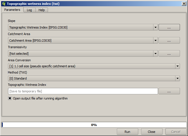 DEMဟုနာမည်ပေးထားသော raster input တစ်ခုတည်းသာရှိသည့်အတွက် Elevation parameter ထဲတွင် ထို DEM raster layer ကိုသာ မြင်တွေ့ရမည်ဖြစ်သည်။Algorithm ကို model တစ်ခု၏ အစိတ်အပိုင်းတစ်ခုအဖြစ်အသုံးပြုသောအခါ algorithm မှထွက်လာသော output ကို ကိုင်တွယ်ပုံသည် အနည်းငယ်ကွဲပြားပါသည်။ Output တစ်ခုချင်းစီကိုသိမ်းဆည်းရန် ဖိုင်လမ်းကြောင်းရွေးချယ်ပေးရမည့်အစား ထို output သည် intermediate layer တစ်ခု (ကြားအဆင့်တွင် လိုအပ်သော layer) ဟုတ်/မဟုတ် သို့မဟုတ် နောက်ဆုံး output တစ်ခု ဟုတ်/မဟုတ်ကိုသာ သတ်မှတ်ပေးရမည်ဖြစ်သည်။ ဤဥပမာတွင် ယခု algorithm မှထွက်လာသော layer များအားလုံးသည် intermediate layer များဖြစ်ပါသည်။ ၎င်း layer များထဲမှ တစ်ခု (slope layer) ကိုသာ အသုံးပြုမည်ဖြစ်ပြီး ထို layer ကို သိမ်းဆည်းမထားလိုပါ၊ ထို layer သည် နောက်ဆုံးရလာဒ်ဖြစ်သည့် TWI layer ကိုတွက်ချက်ရန်အတွက်သာ လိုအပ်သောကြောင့်ဖြစ်သည်။